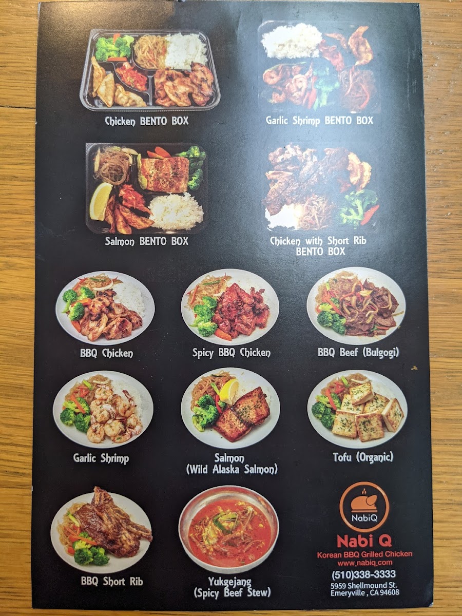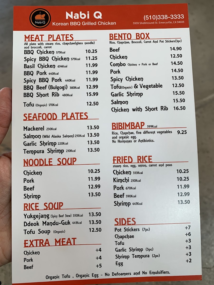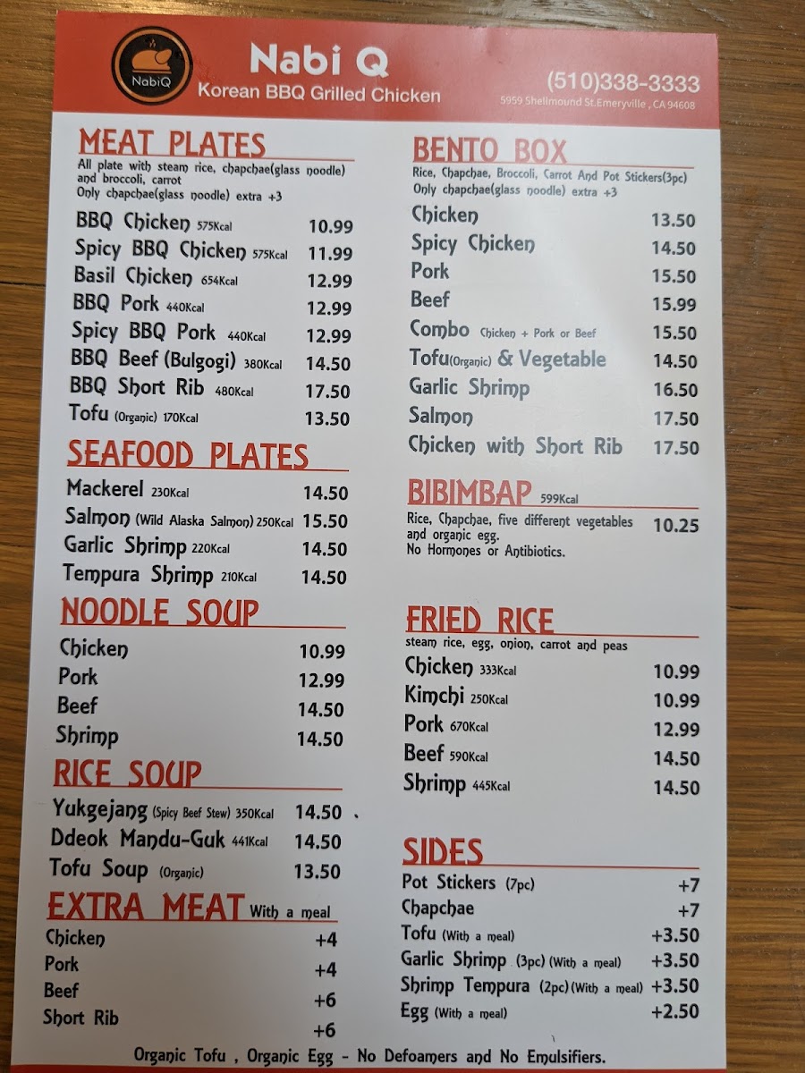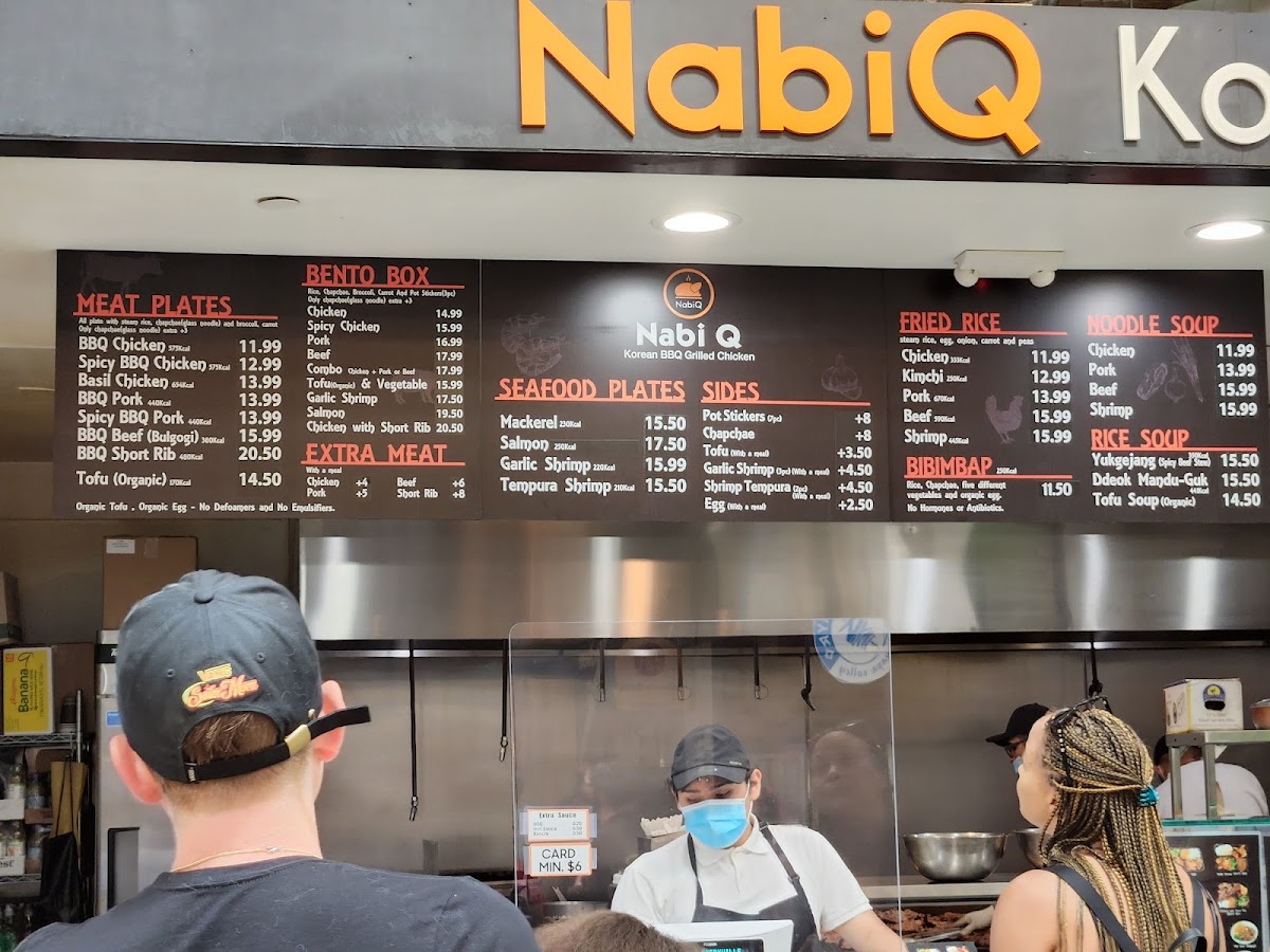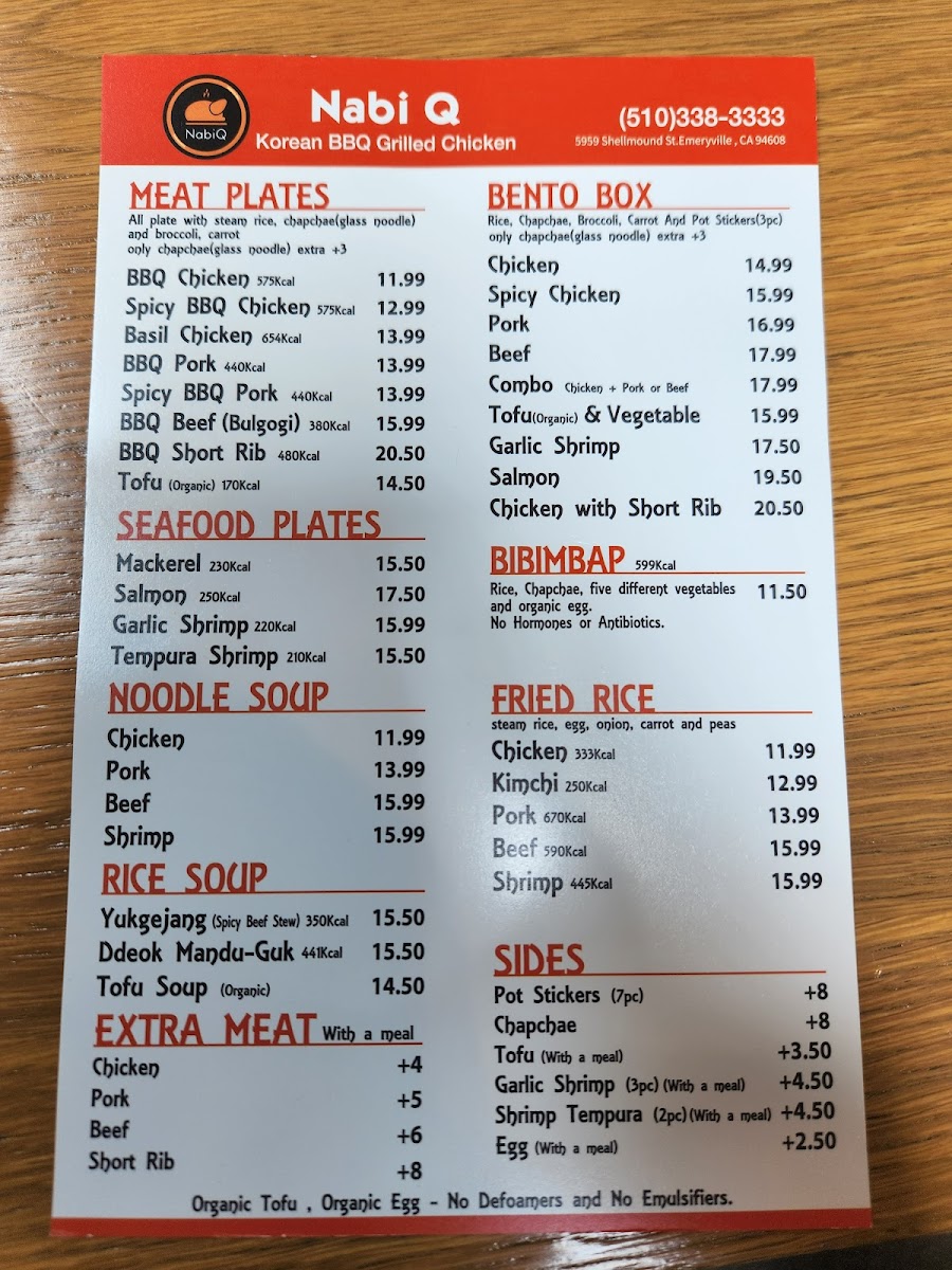 Nabi Q Korean BBQ offers a diverse and delicious menu with a wide range of options to satisfy all tastes. For beverages, they have options like Bottle Drink, Can / Water, TeaRamune, and SOJU. The side dishes include flavorful choices such as Pot Sticker, Chap Chae Side, Tofu Side, Garlic Shrimp, and Shrimp Tempura. If you're looking to add more protein, you can opt for Extra Chicken, Extra Pork, Extra Beef, or Extra Short Rib. Their fried rice selection is impressive, featuring dishes like Fried Rice Chicken, Fried Rice KimChi, Fried Rice Beef, Fried Rice Shrimp, and Fried Rice SCH. For a traditional Korean touch, the BIBIM BAP is a must-try. The Bento Box options are diverse, including Beef Bento Box, Chicken Bento Box, Combo Bento Box, Pork Bento Box, and Spicy Chicken Bento Box. Soup lovers can enjoy comforting choices like YuKgeJang, Ddeok Mandu-Guk, and Tofu Soup. For seafood enthusiasts, the Mackerel Seafood Plate, Salmon Seafood Plate, Garlic Shrimp Seafood Plate, and Tempura Shrimp Seafood Plate are great options. The meat plates offer a variety of BBQ options, such as BBQ Chicken Meat Plate, Spicy BBQ Chicken Meat Plate, Basil Chicken Meat Plate, BBQ Pork Meat Plate, and Spicy BBQ Pork Meat Plate. Overall, Nabi Q Korean BBQ presents a well-rounded menu filled with exciting flavors for anyone craving authentic Korean BBQ dishes.